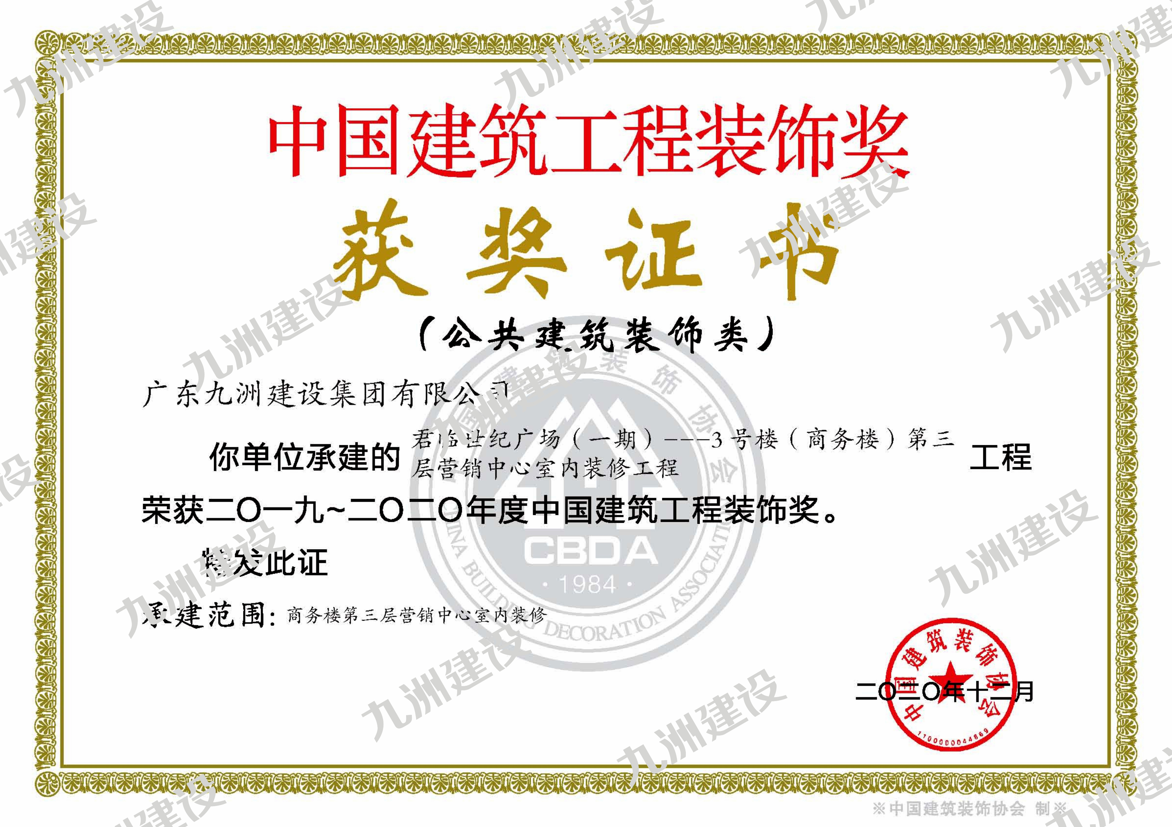 由我司承建的君臨世紀(jì)廣場(一期)--3號樓(商務(wù)樓)第三層營銷中心室內(nèi)裝修工程項(xiàng)目,榮獲2019-2020年度“中國建筑工程裝飾獎”,是全國建筑裝飾行業(yè)最高榮譽(yù)獎,也是裝飾行業(yè)唯一經(jīng)國務(wù)院批準(zhǔn)的國家級獎項(xiàng),獲獎工程的設(shè)計(jì)創(chuàng)意與施工工藝均須達(dá)到國內(nèi)領(lǐng)先水平,是中國建筑裝飾行業(yè)最高榮譽(yù)。